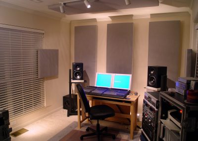 I was recently contacted by veteran star engineer Bob Bullock (Shania Twain, etc.), who had heard of the work I was doing relative to the above. He felt that he might be able to reference his mixes and work on his development projects at home if he set up a small control room and a simple Pro Tools system but was reluctant since he was such a huge fan of big SSL’s and large monitoring systems in major rooms. Although skeptical, he agreed to engage my expertise and we were off and running. A dining room that was not being used was chosen and the first thing I asked him to do was to send me the measurements, approximately 12’x10’x8’, length, width, height as well as photographs of the room. There was a large opening into a living room on the right wall that I had him fill with a pair of French doors and Venetian blinds to create symmetry and match the large blind filled window on the left wall. There was also a small door opening at the back wall. I designed a series of acoustic panels and specified their placement.