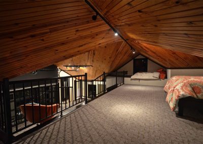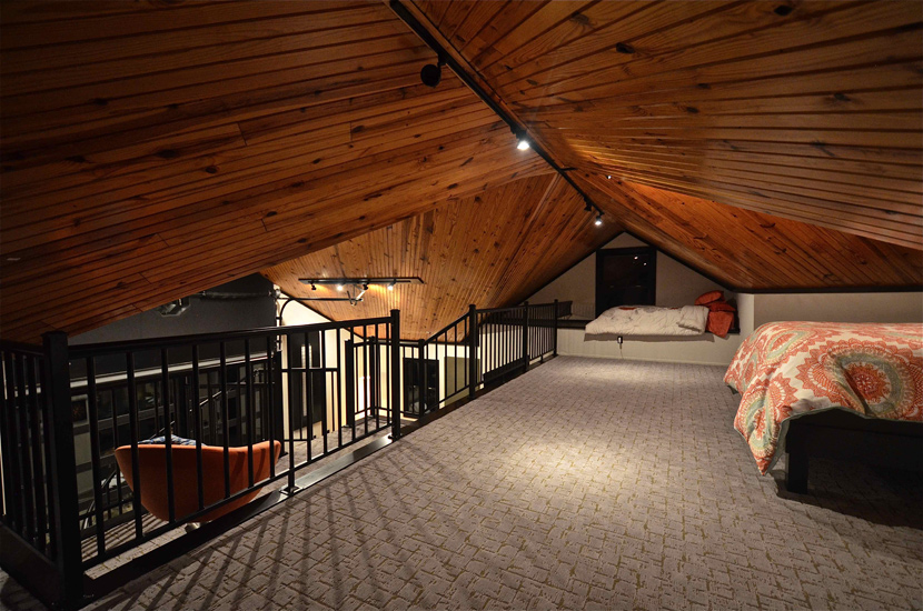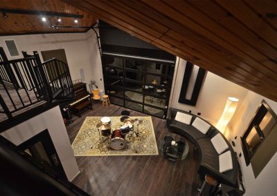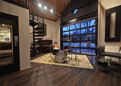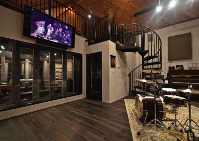 The Fly By West tracking room’s multi-angled twenty-foot high knotty pine, tongue-in-groove ceilings are shared with a multi-purpose loft that is reached via a wrought iron spiral staircase. The loft area can be used by out-of-town clients for stay-over projects and offers great acoustic variety when tracking. The uniquely positioned over-dub booths at the control room’s rear attest to West’s preferred M.O.