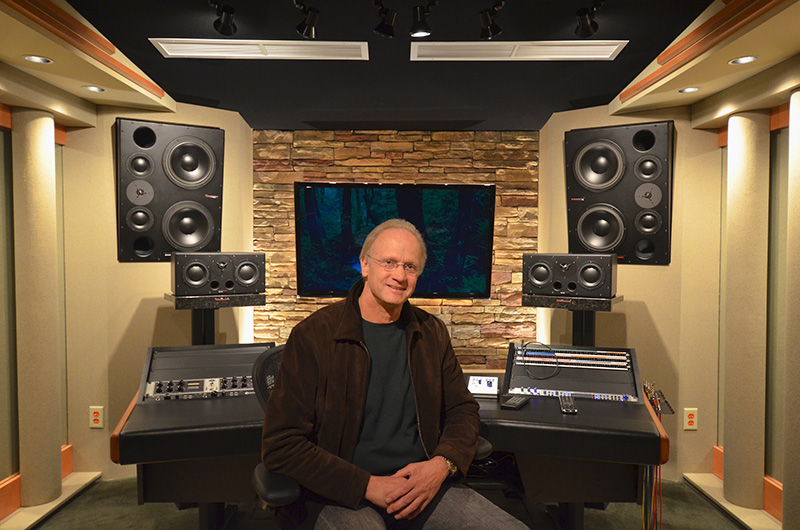 Carl Tatz sits at the console in his award winning Blue Grotto studio with the Dual PhantomFocus™ System featuring Dynaudio Professional M1 and M3 monitors