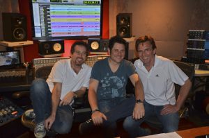 Pictured L-R: Engineer, Justin Neibank, Jay DeMarcus, Producer, Dann Huff at the Console in the Grip Control Room