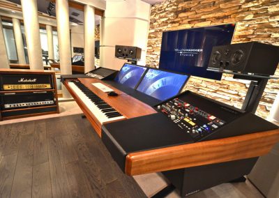 Poorly-placed video screens can be problematic for optimum audio imaging and that’s why we spec large wall-mounted LCD screens for computer displays. However, in Justin’s case, being a film composer and needing multiple screens, we had to come up with a solution to allow for a total of three screens and not compromise the PFS performance. We were able to take Justin’s idea of how he wanted his Doepfer LMK2+ MIDI keyboard controller positioned in the desk and applied a deep-mount screen application for two video monitors with the help of Argosy Console CEO David Atkins and his design team. So successful was this collaboration that Argosy is now offering a new line of workstations inspired by it under the Carl Tatz Edition™ moniker.