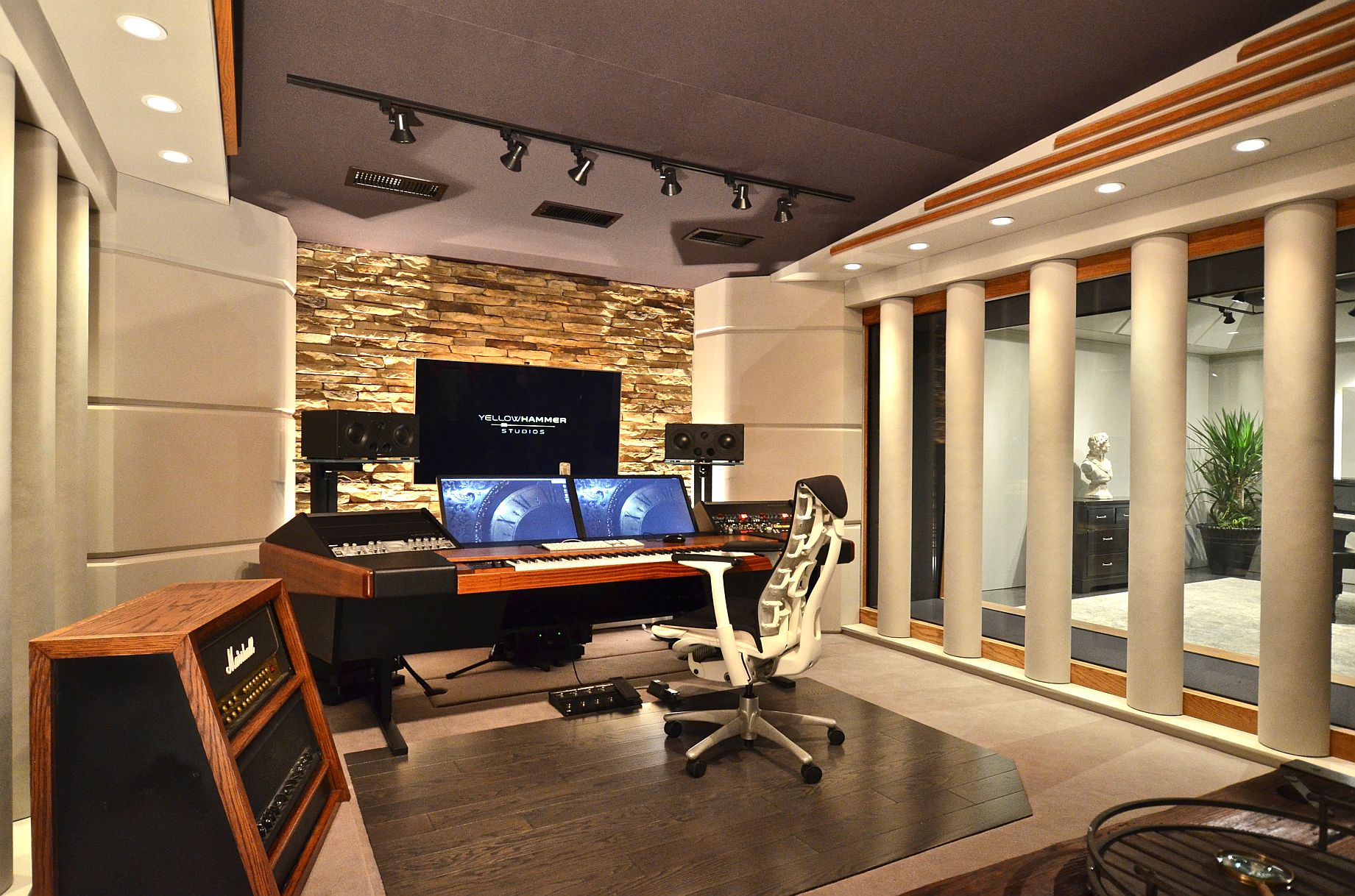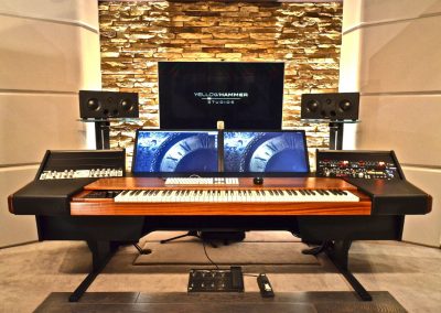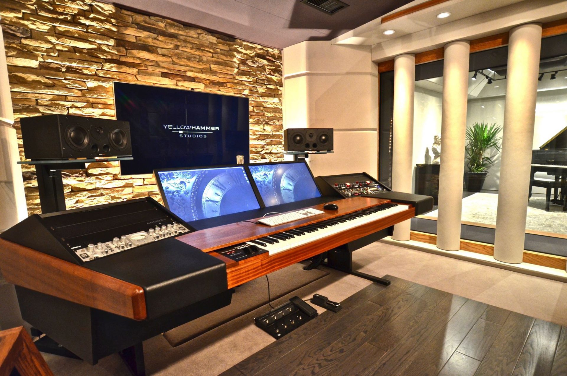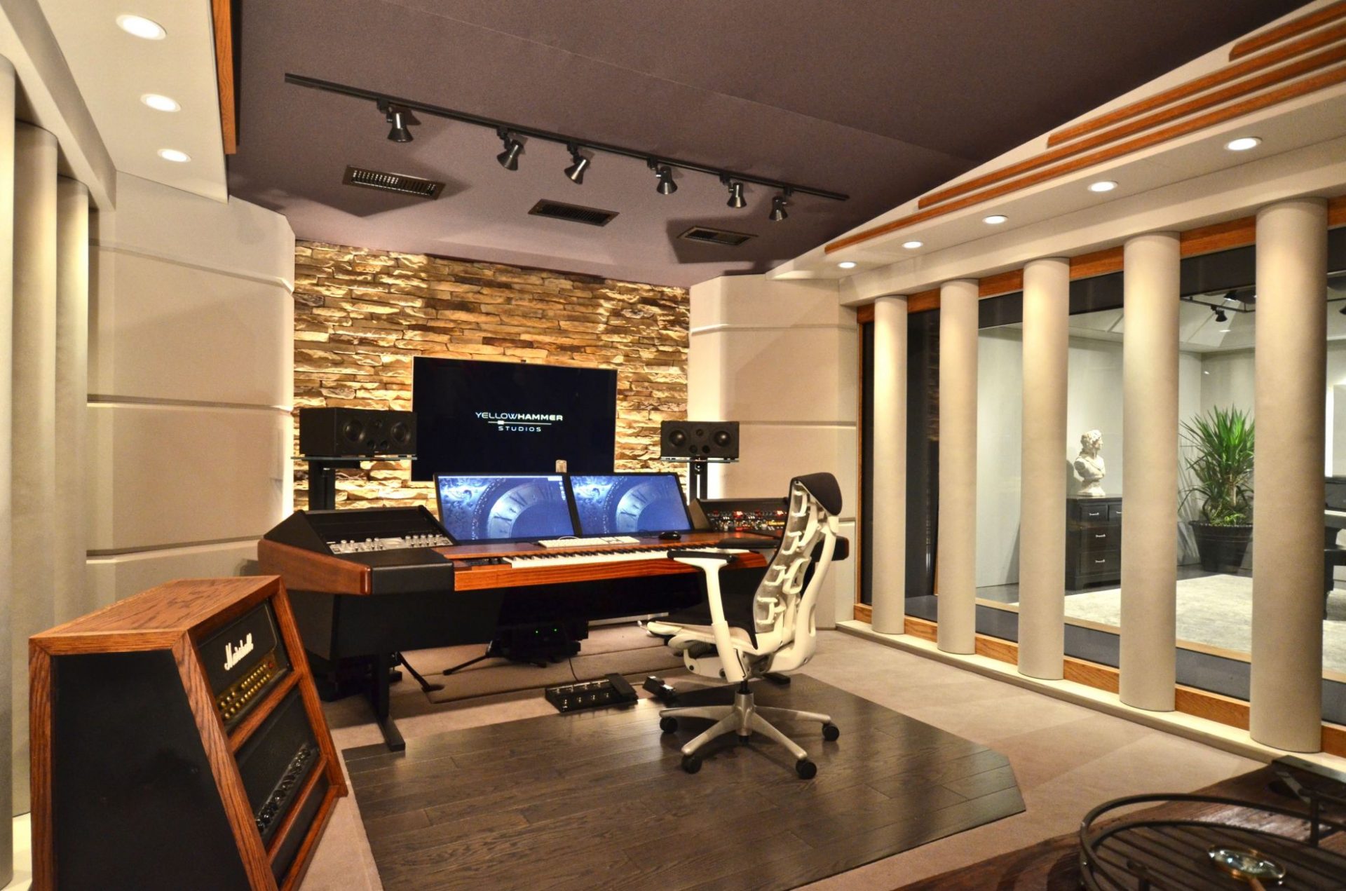 Yellow Hammer is a 630 sq. ft. full tilt custom Carl Tatz Design studio built from the ground up for film composer Justin Ray Miller on the property of his Nashville home. Opened February 2014, it encompasses a CTD MixRoom™, piano booth, restroom, computer closet and hall-of-shame foyer. It features the acclaimed PhantomFocus™ System™ (PFS™) driving a Dynaudio Professional M1 monitor/ Bryston 4B Pro SST2 amplification combo and a custom application of the Carl Tatz Design Signature Series™acoustic modules by Auralex. It also features a custom application of the new Carl Tatz Edition™ Dual 15-KL800 workstation by Argosy Console.